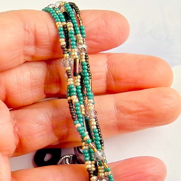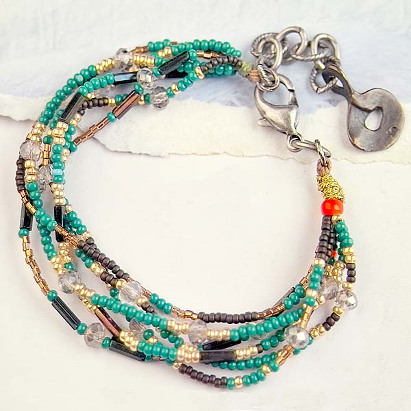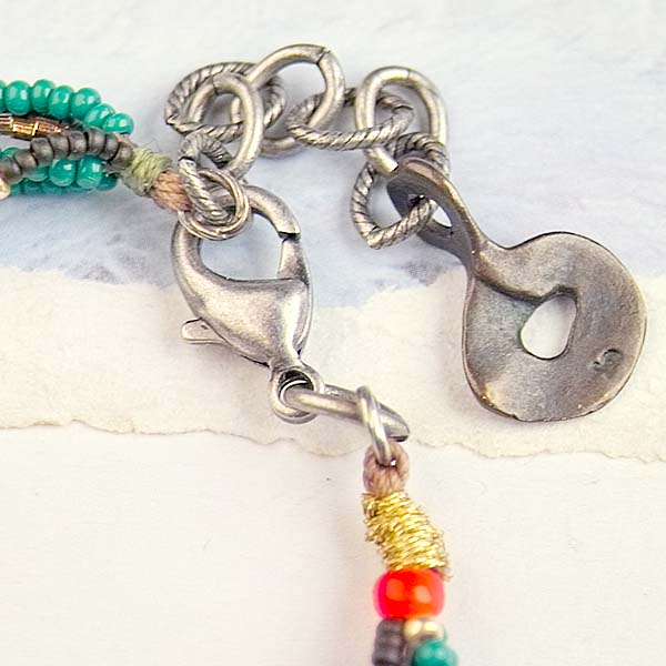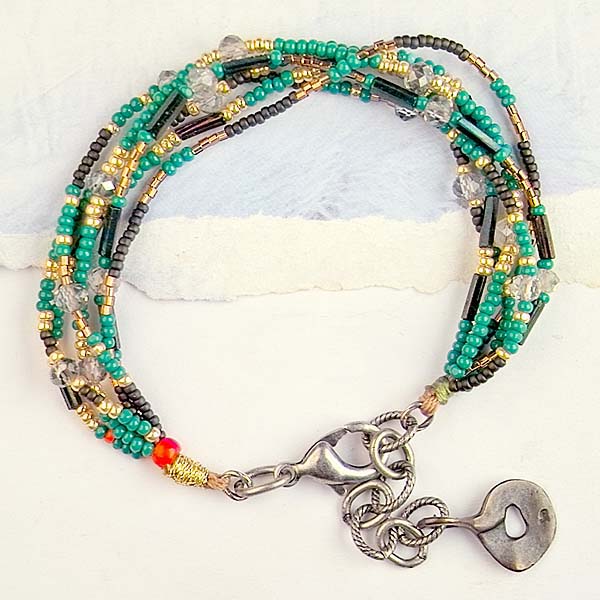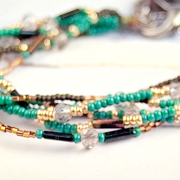 7 strands of beautiful glass and crystal beads. Red heart trade beads tucked in between with metallic thread detail and an adjustable length closure.