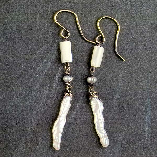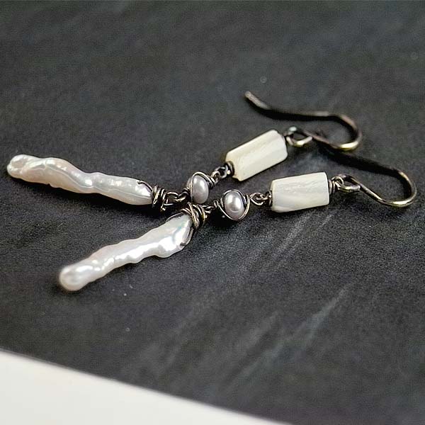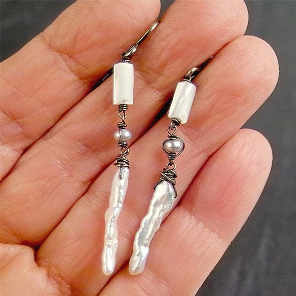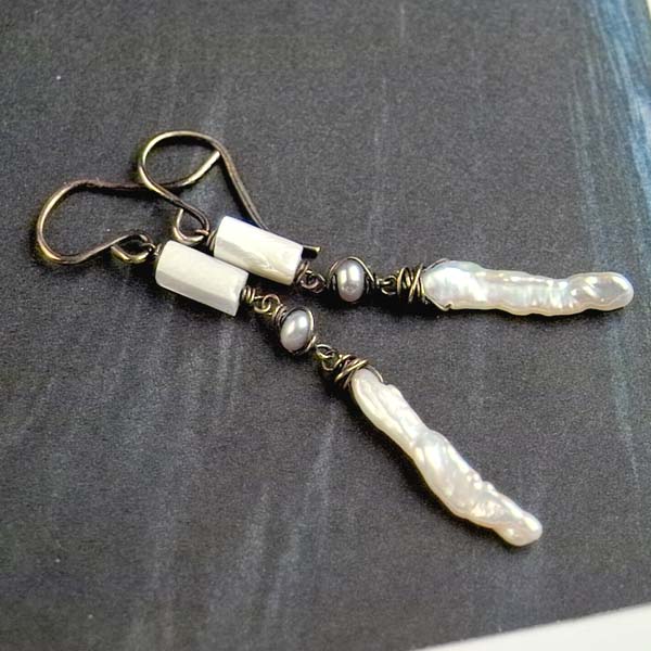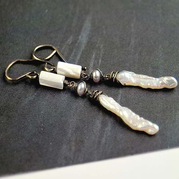 - MOP tubes with beautiful sheen 8 x 4mm - vintage white button pearls 3.5mm - Biwa stick pearls 20mm long