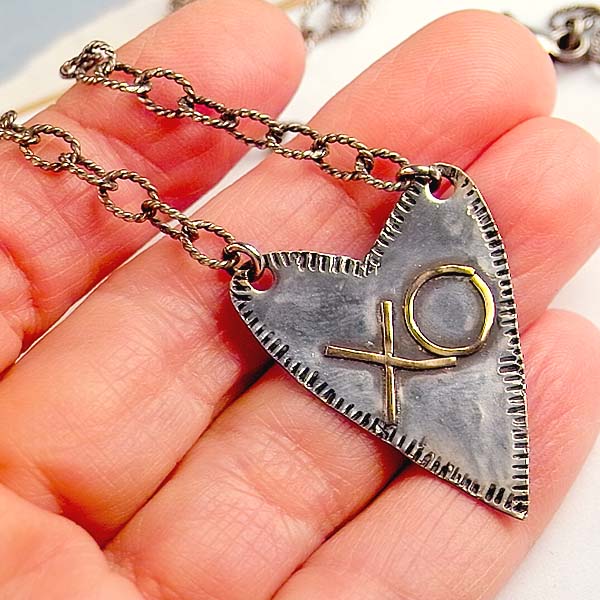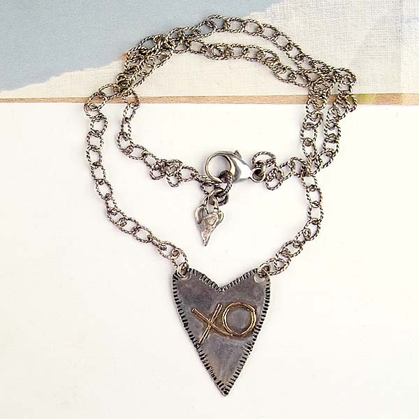 A heart in the center with outline details and an XO in gold. The necklace is a big link, textured chain with a smaller heart dangle at the big lobster claw closure.