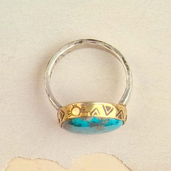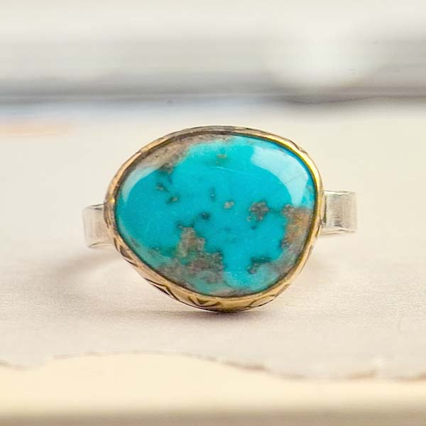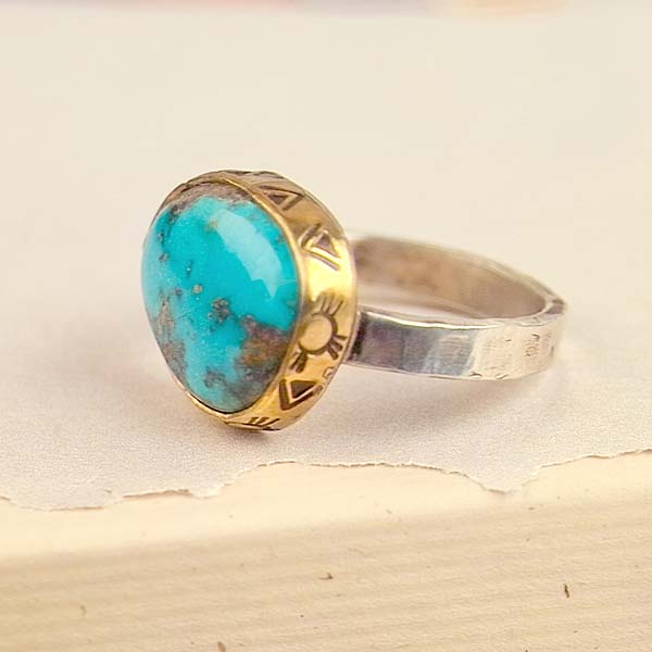 This lovely turquoise nugget hails from the Nevada Blue mine. It's a brilliant blue with it's own unique matrix. Each nugget is a one of a kind work of art by Mother Nature. I created a golden bezel with stamped designs all around and a textured silver shank.