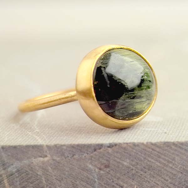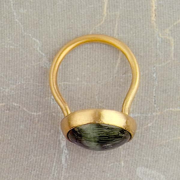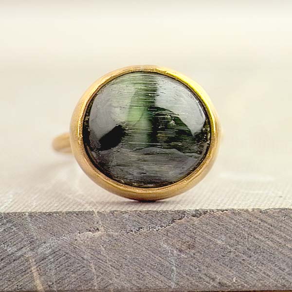 An incredible green cat's eye tourmaline. The optics are amazing as you turn the stone from side to side, which is obviously impossible to show in a still photo. Gorgeous emerald green color with some striations within. I bezel set the gem in golden jewelers brass that looks like 18 KT gold. I created a raised shank that the stone sits upon, so that you can snuggle up any ring guards you may already have for a different presentation. Silver and white gold would work just as well as any yellow gold. It's a simple ring, with an incredible stone, with variety of wearable options.