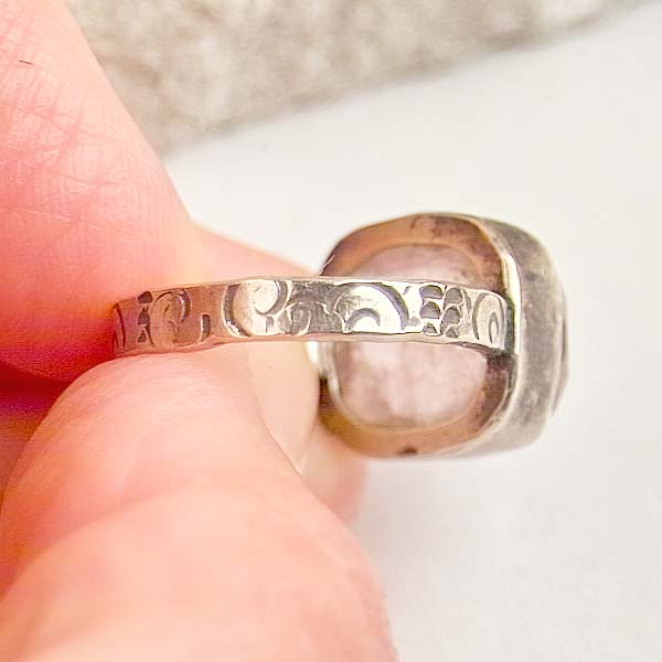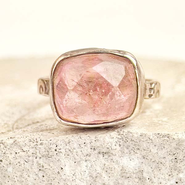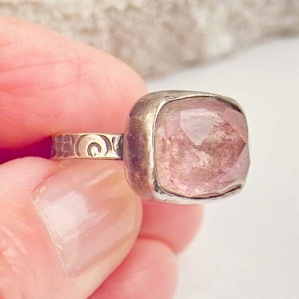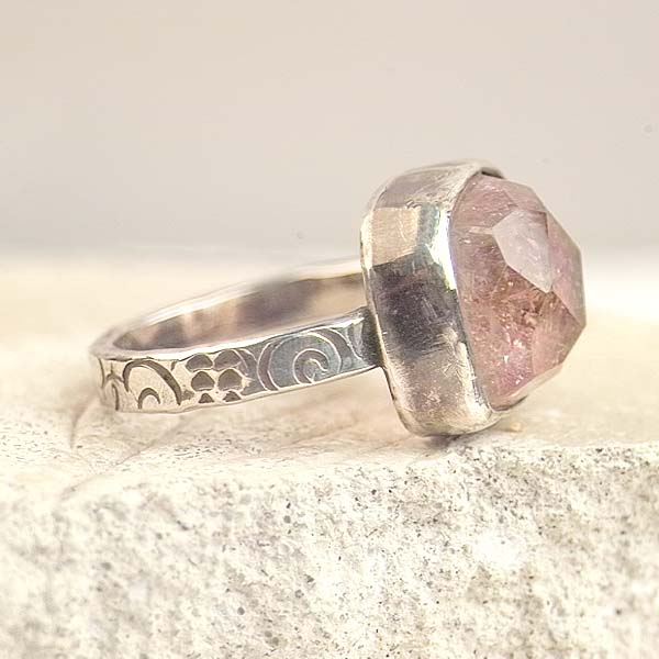 A chunky 16 carat, rose cut, pink tourmaline in a hand crafted setting. Plain sterling bezel with carved shank!