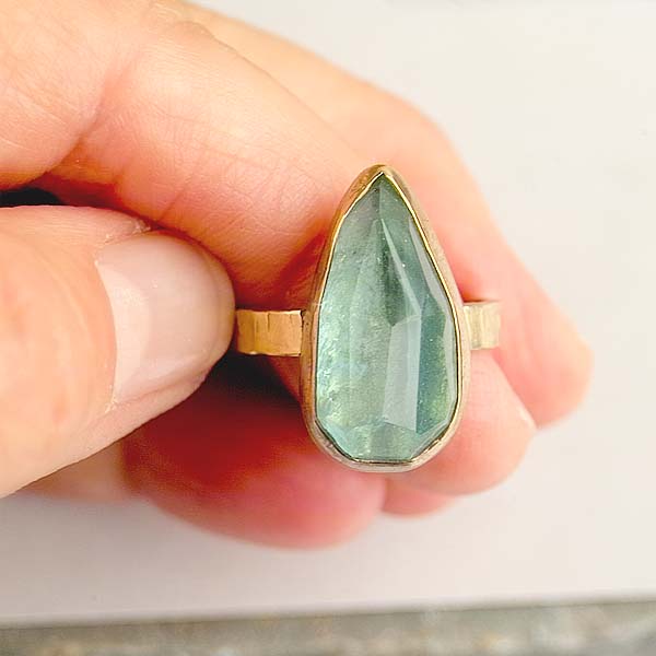 One look at this serene color will take your breath away. This is a large, 13.5 carat, faceted gemstone. I bezel set it with a simple, lightly textured band. No need for fancy doo-dads. This stones steals the show!