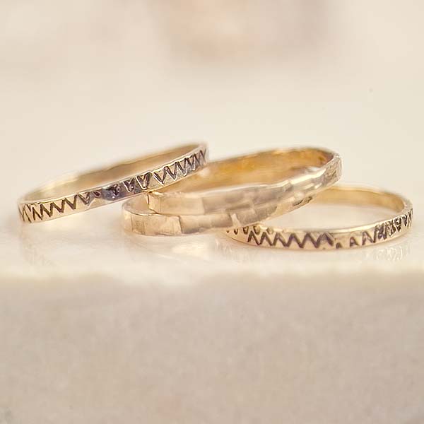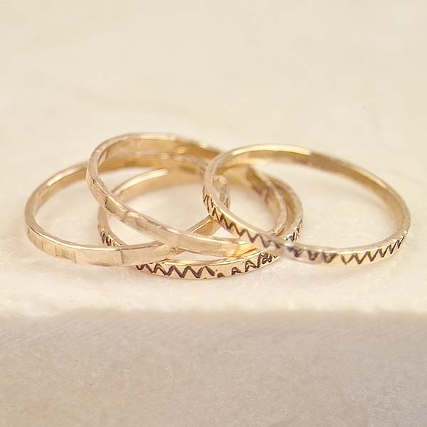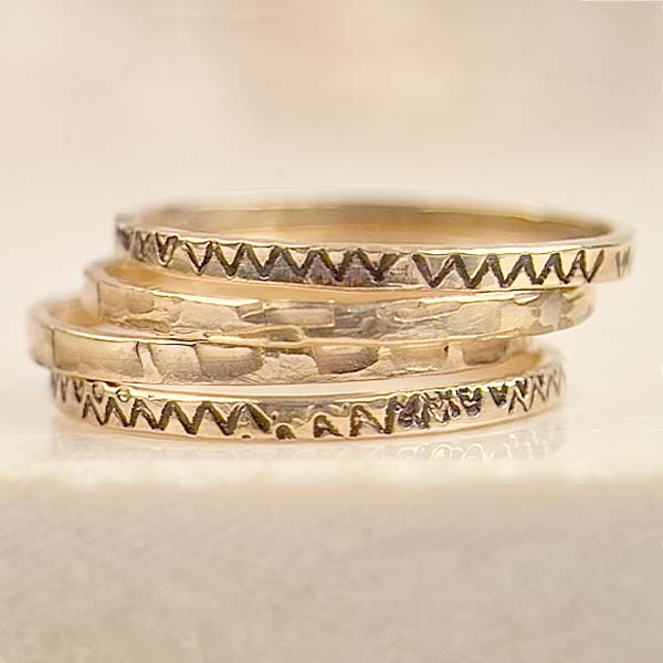 A set of four golden rings. Two are textured with a hammered surface. Two are etched and blackened for contrast. Wear together of course, or use as ring guards with one of your gemstone rings in the center. Lots of possibilities. Let your imagination run!