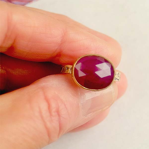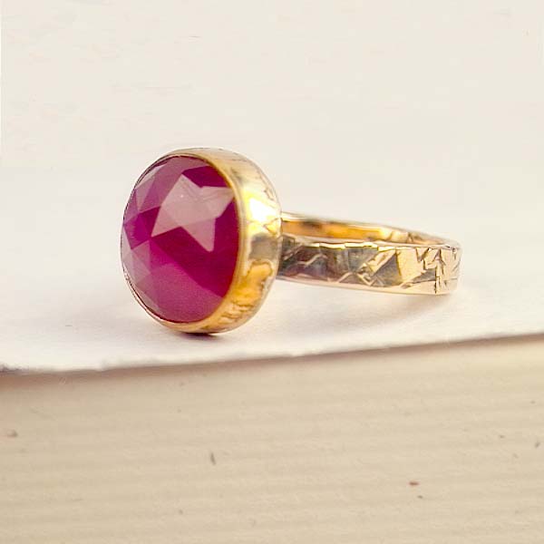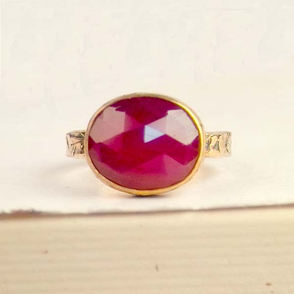 A gorgeous, glossy, scarlet red ruby set in 14KT gold. The bezel has a "crinkle" finish and the hand forged shank is hammer textured. I oxidized the gold and polished it up so the textures are more pronounced.