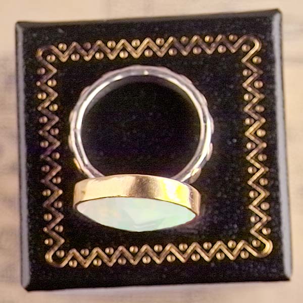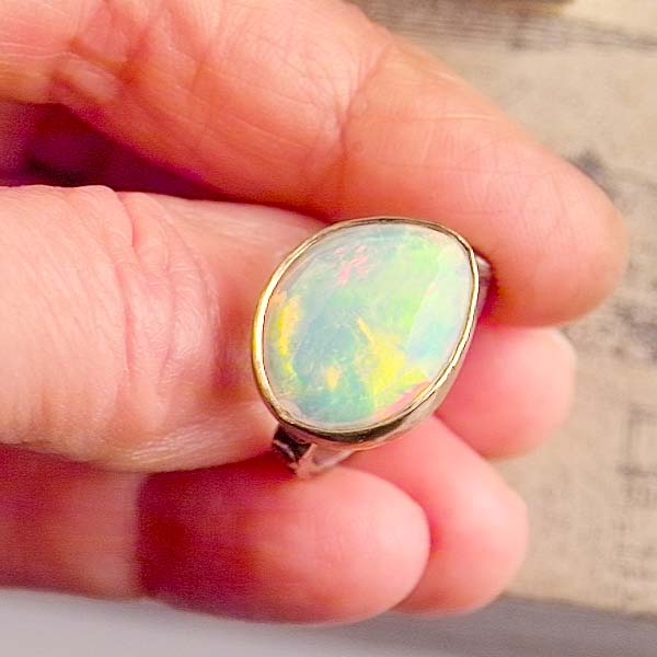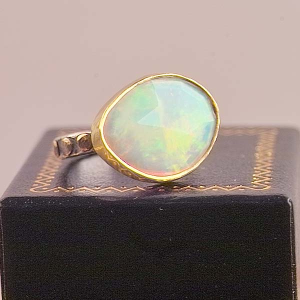 This rose cut Ethiopian opal is magic! The lightshow within is mesmerizing! Every color of the rainbow seems to be represented inside. Pink, orange, magenta, green, blue, violet¡Kall here. The stone is wrapped in a bezel of gold and I detailed the sterling shank with gold dots. Entirely hand crafted with meticulous care!