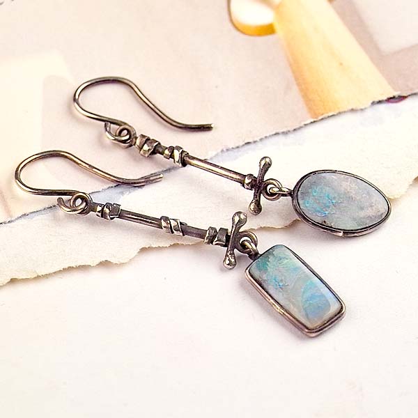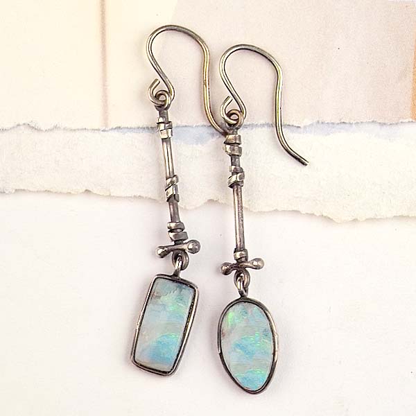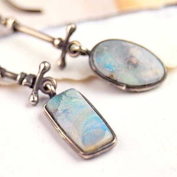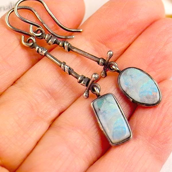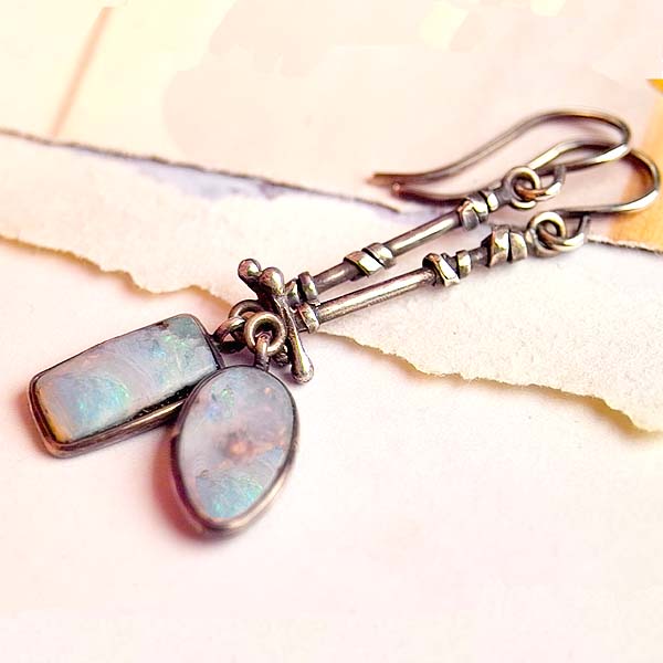 I just love Boulder opals! The colors, the flashes, the uniqueness of each and every piece! Amazing! I used two different shapes, with similar coloration, making a lovely, mismatched match. I handcrafted the sterling stick charms. So pretty!