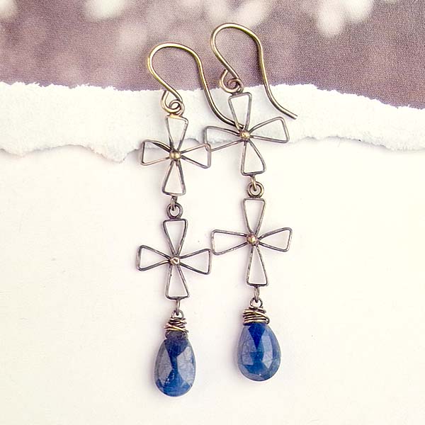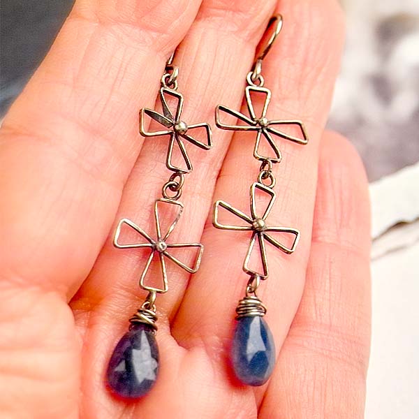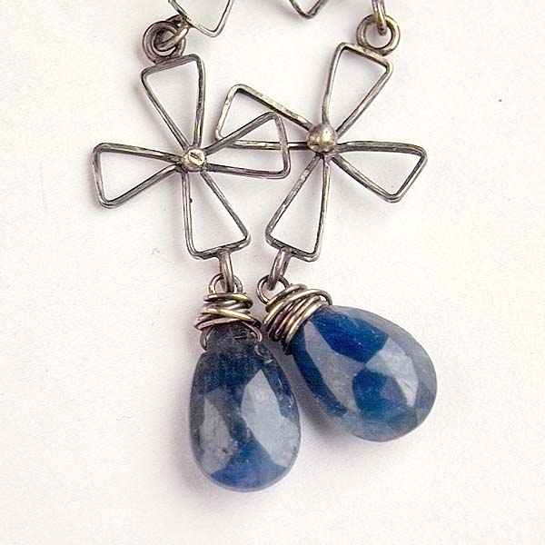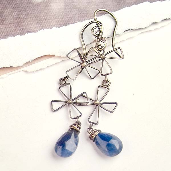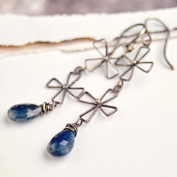 Beautiful blue color, these faceted sapphire stones dangle from handmade sterling silver flowers. Each earring has been meticulously created form scratch!
