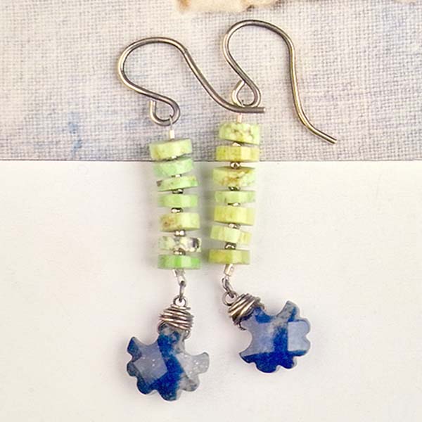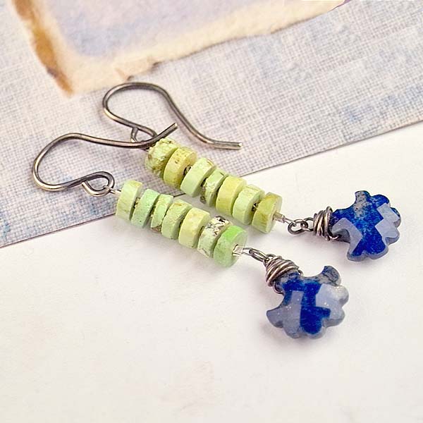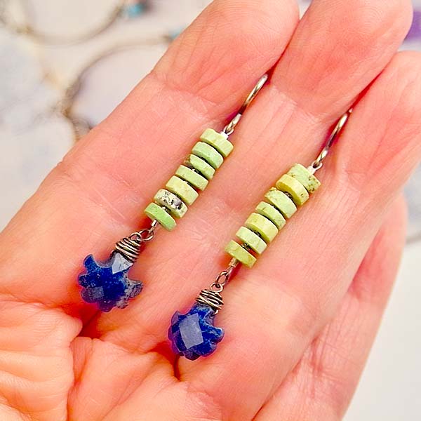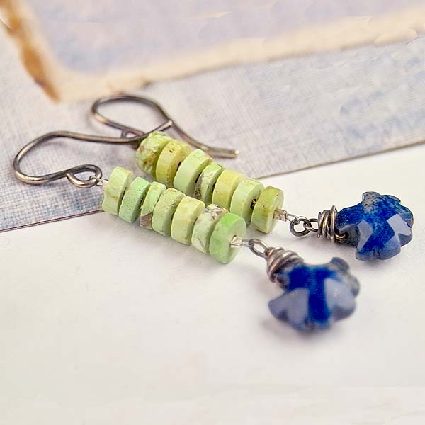 These are on fire! Bright green gaspeite and strong cobalt blue lapis with pyrite inclusions. A stunning combination of gemstones! Tiny faceted, vintage cut steel spacers are an added detail that make these baubles special.