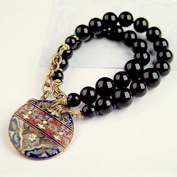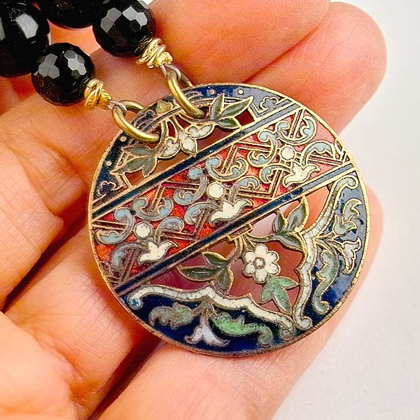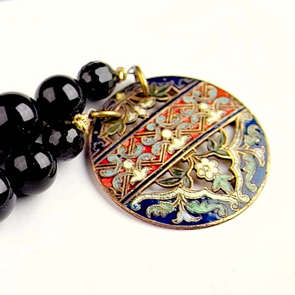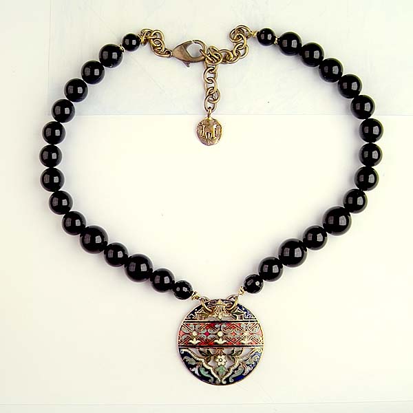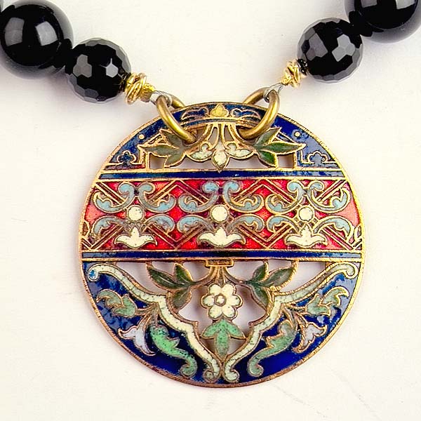 - repurposed brass & enamel button pendant 1 1/2 inches in diameter